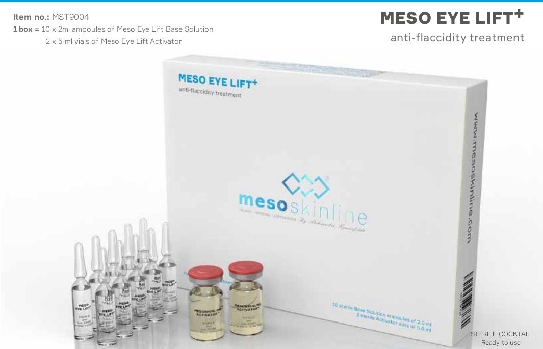 Το meso eye lift είναι ένα αποτελεσματικό mesococktail που αναπτύχθηκε για την πρόληψη των σημαδιών γήρανσης και την σύσφιξη του δέρματος. Δεν δημιουργεί παρενέργειες και ως θεραπεία είναι συμβατή με άλλα mesococktail και βοτουλινικες τοξίνες. Ως εκ τούτου είναι ένας ήπιος και αποτελεσματικός παράγοντας για ένα πιο σφριγηλό και δυνατό δέρμα.